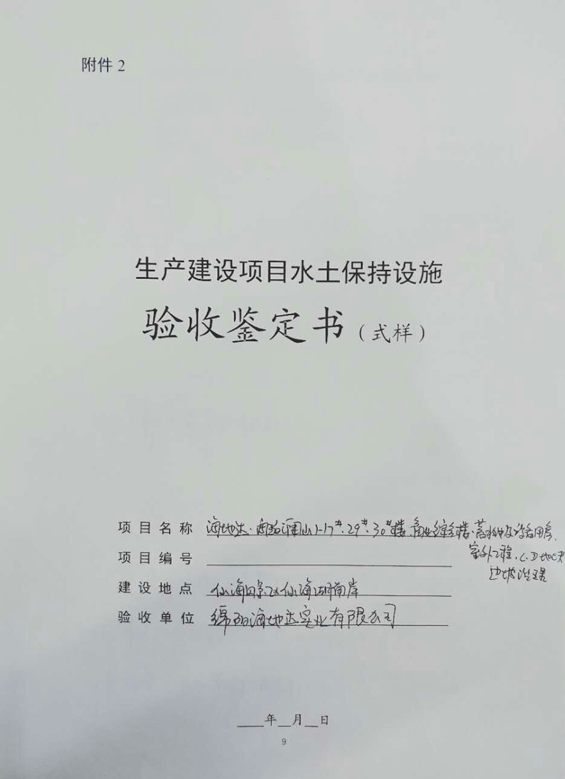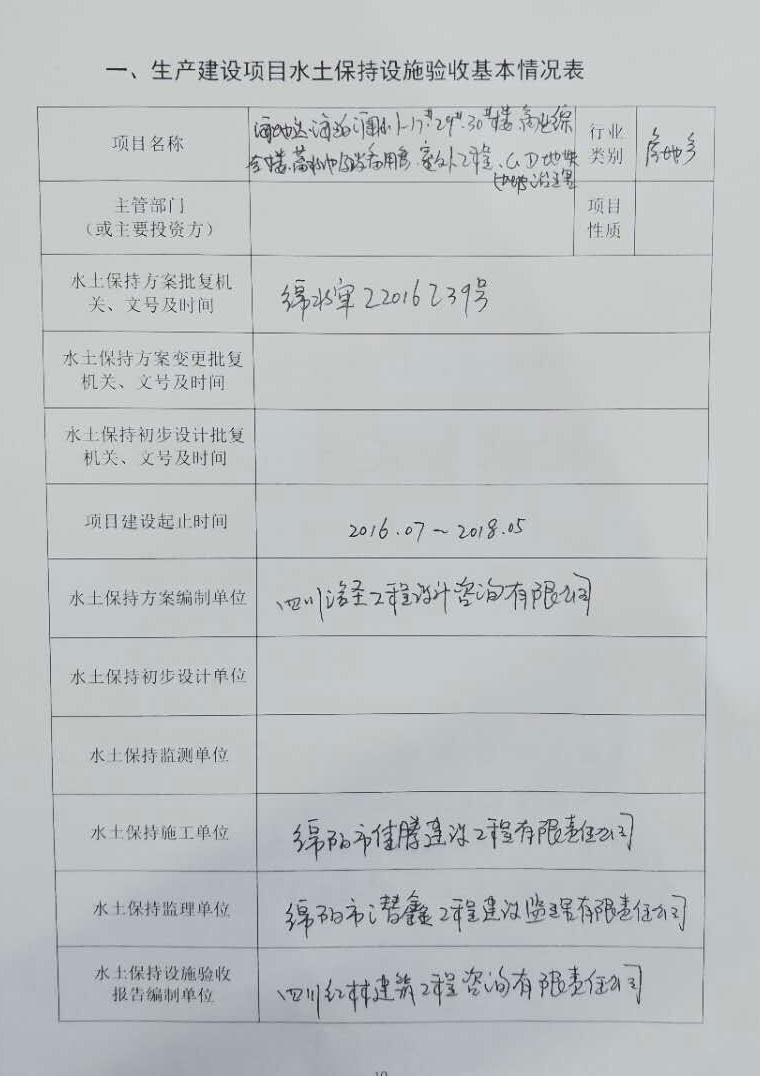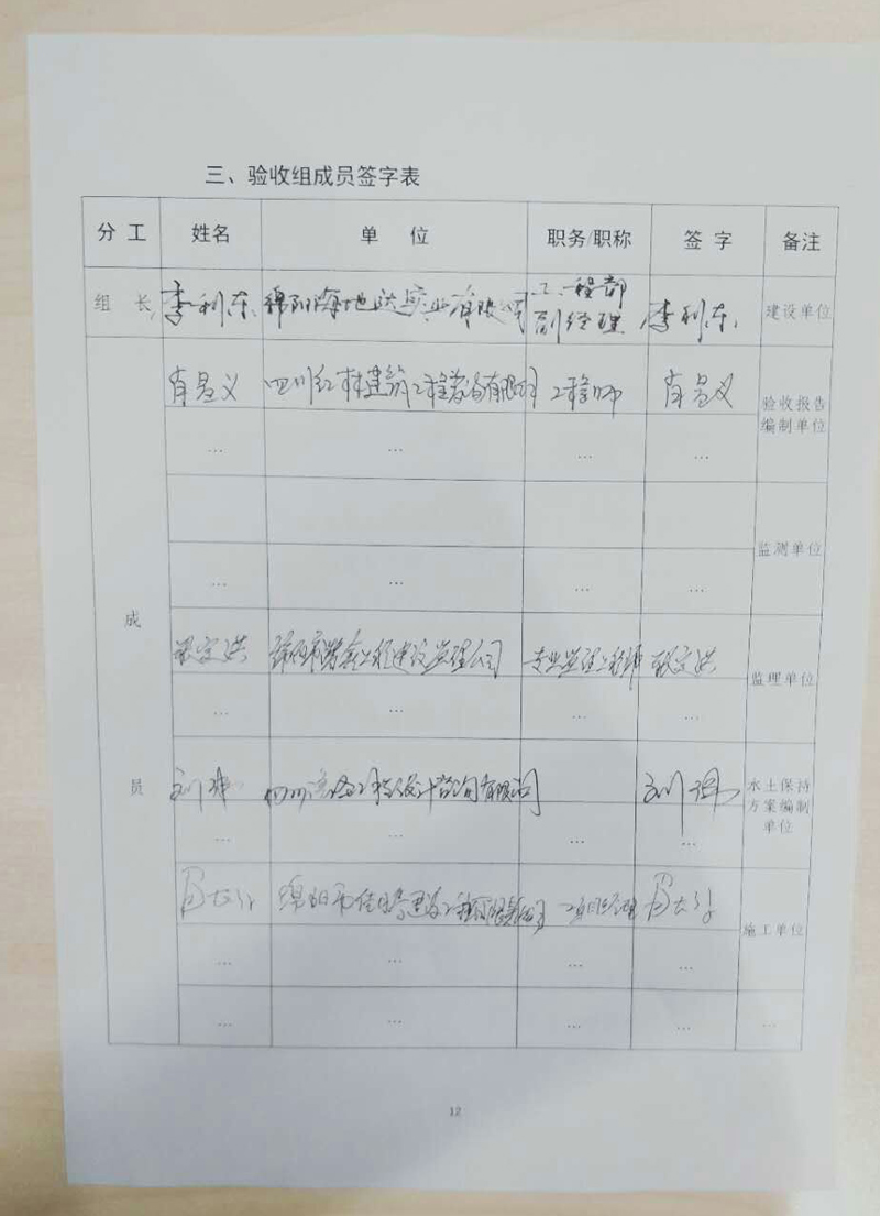 根據(jù)《中華人民共和國水土保持法》、《水利部關(guān)于加強事中后監(jiān)管規(guī)范生產(chǎn)建設(shè)項目水土保持設(shè)施自主驗收的通知》(水?!?017〕365號)及相關(guān)法律法規(guī)的有關(guān)規(guī)定,綿陽海地達實業(yè)有限公司于2018年1月5日對綿陽海地達實業(yè)有限公司投資建設(shè)的海地達·海珀瀾山(一期)項目水土保持設(shè)施進行了竣工驗收。驗收會議由綿陽海地達實業(yè)有限公司主持,參加會議共11人,會議成立了驗收小組(名單附后)。